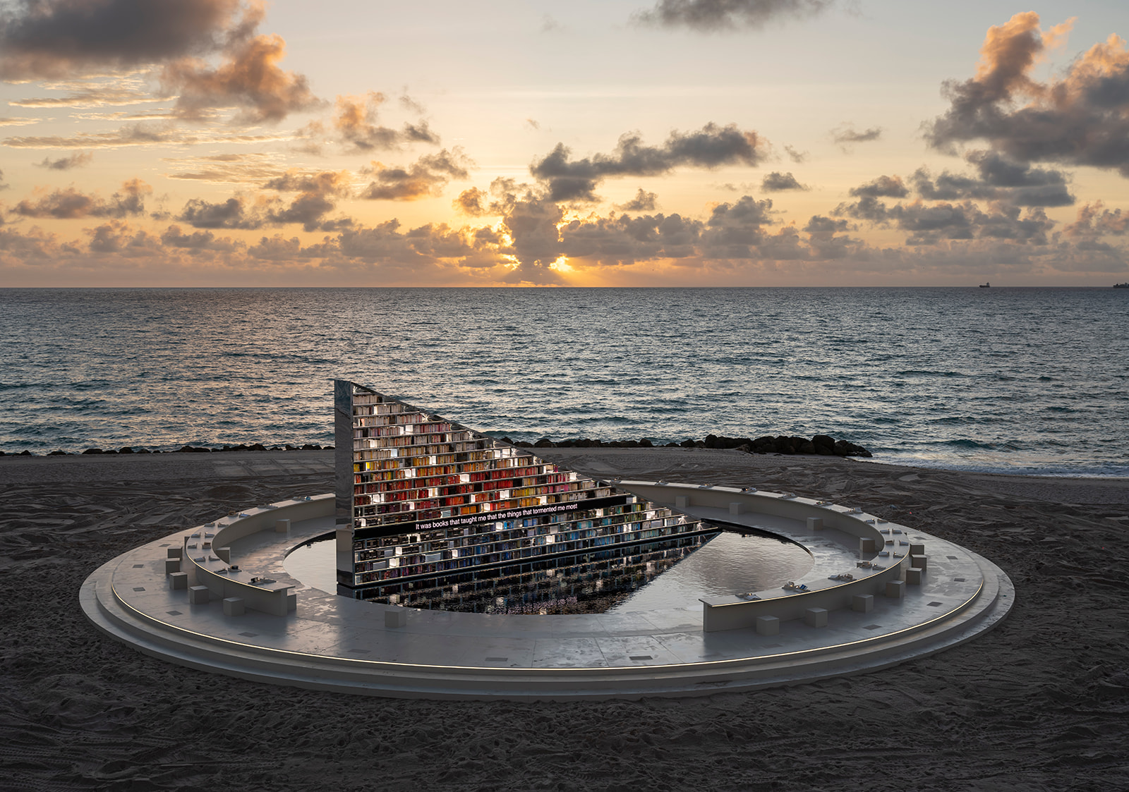 In collaboration with Faena, acclaimed set designer Es Devlin delivered The Library of Us, a beachfront installation showcasing 2,500 titles that the Bristol University English major deems as formative, including works by Jane Austen, Pablo Neruda and Jorge Luis Borges. The books are arranged by color on a 20-foot-tall, triangular bookshelf that rotates at the center of the installation, surrounded by a pool of water. At night, the pool reflects the towering illuminated shelf, creating the illusion of distant ships cutting across the water.