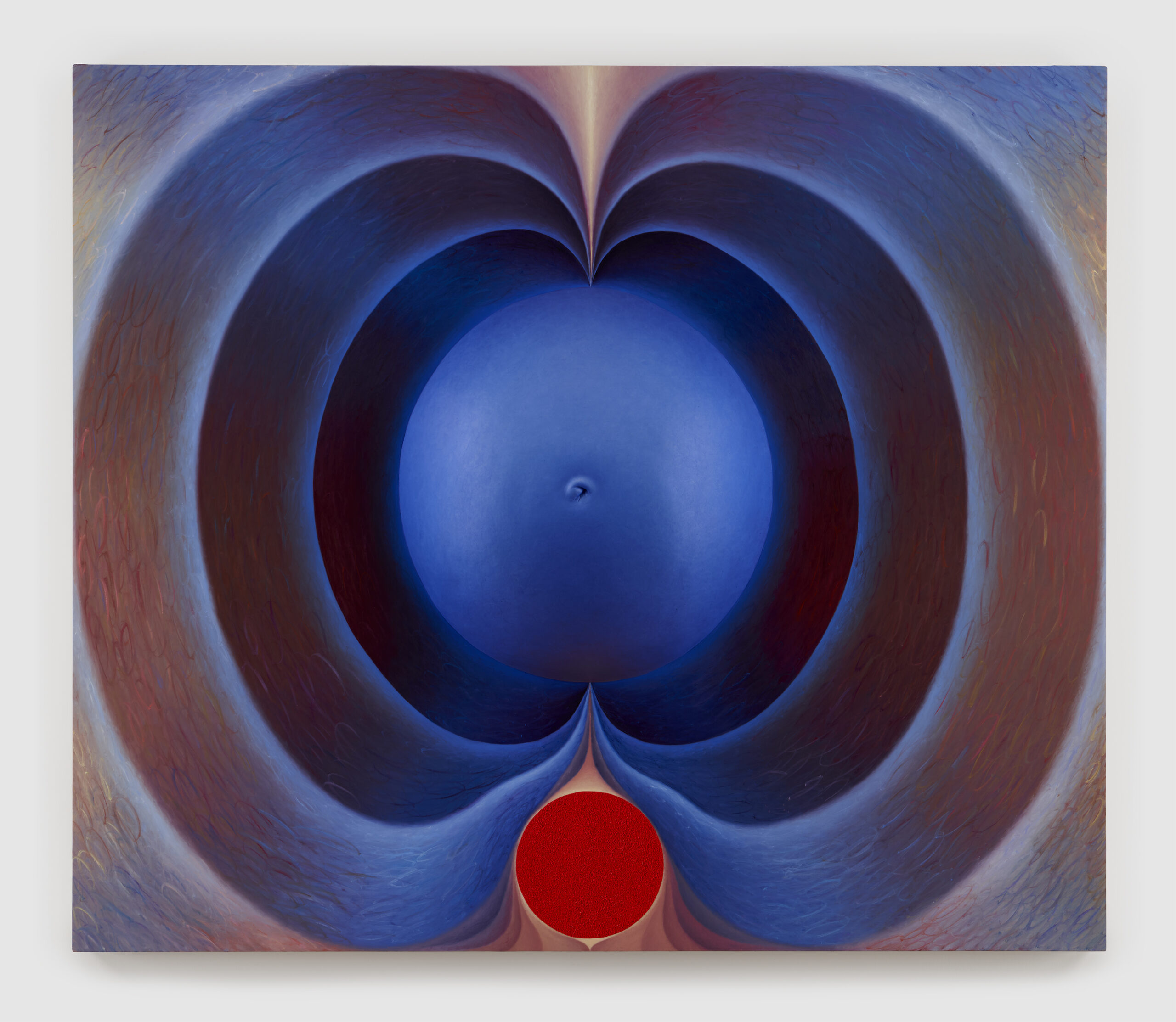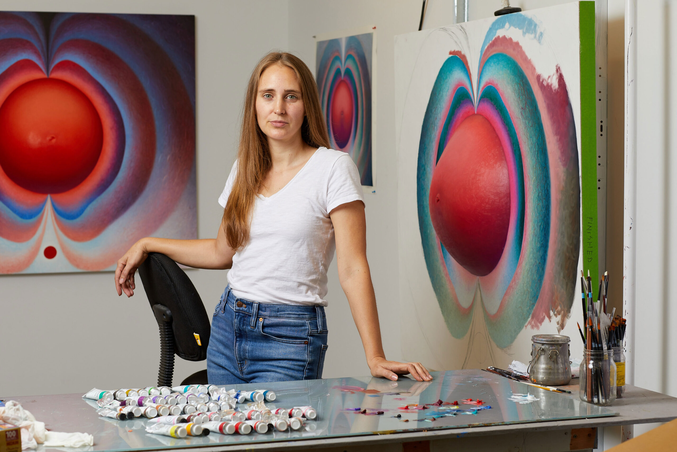 Once upon a time, before the Covid-19 pandemic—before I was married, before I was pregnant—I visited the painter Loie Hollowell’s studio in Queens, with our mutual friend, Haley Mellin. I was taken with the scale and symmetry of her abstract, geometric works, but also with her ability to wrangle her then-toddler, who was running around the space as we appraised the paintings. At five months pregnant myself now, and grappling with what that means for my identity, I thought there was no better person to speak with than Hollowell, an artist and mother whose entire project explores the female body.