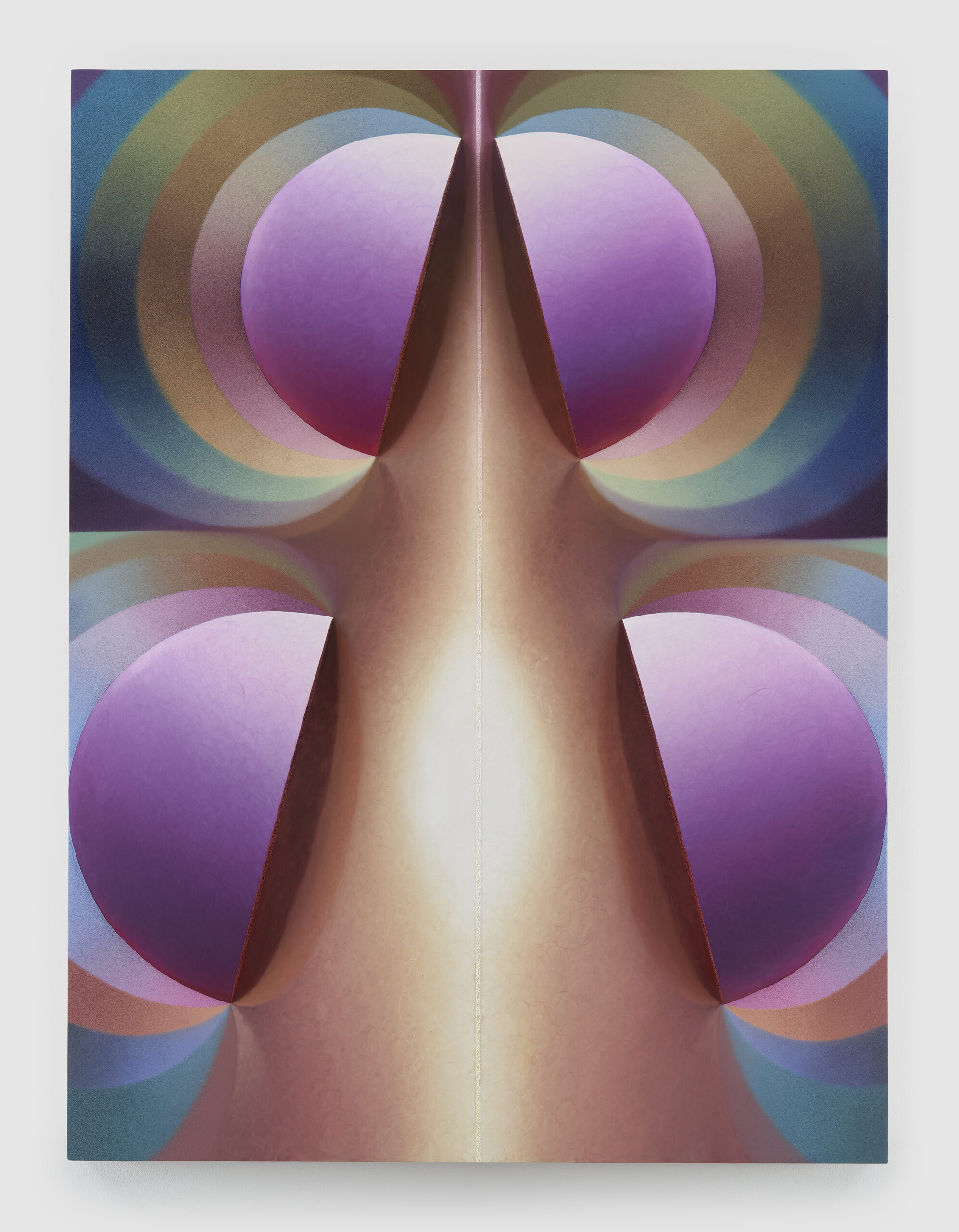 Loie Hollowell, Split Orbs in fuchsia, green, blue and yellow, 2022. Photography by Melissa Goodwin.