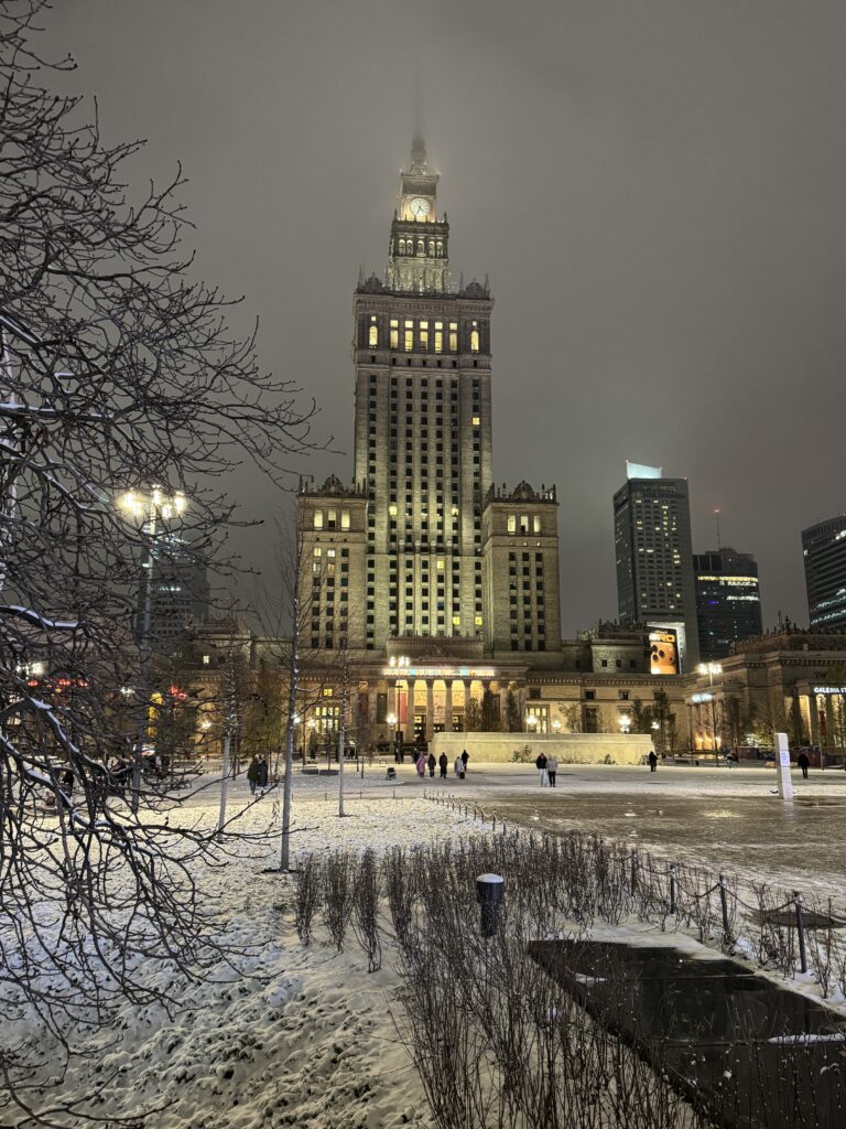 When I finally arrive at the hotel, I’m almost due at the museum, but I lie down in the beautiful room, order soup and cake from room service, and wonder why go to the press preview when I can just go to the party later? I rest and set out for the museum as the sky grows dark, winding through a park and then down wide streets, veering off course to walk through the vast, almost empty grounds of the Saxon Palace, destroyed during WW2. Intrigued by the torchlight beneath the remaining block of neoclassical arches—the eternal flame, I realize in a moment—I watch, from a good distance, the changing of the guard at the Tomb of the Unknown Soldier. Soon, I reach Marszalkowska Street and see the museum, a sparkling white boxy structure standing in the shadow (so to speak) of the Palace of Culture and Science—the hulking, ornate skyscraper, built by Stalin in the 1950s as a gift to the Polish people at the edge of the former site of the Warsaw Ghetto.