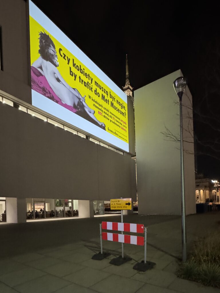 I stand in the cold watching a billboard-scale slideshow projected on the side of the new museum. The first image, though its text has been translated into Polish, is instantly recognizable, with its gorilla-masked Grande Odalisque, as the Guerrilla Girls’s 1989 poster Do women have to be naked to get into the Met. Museum?