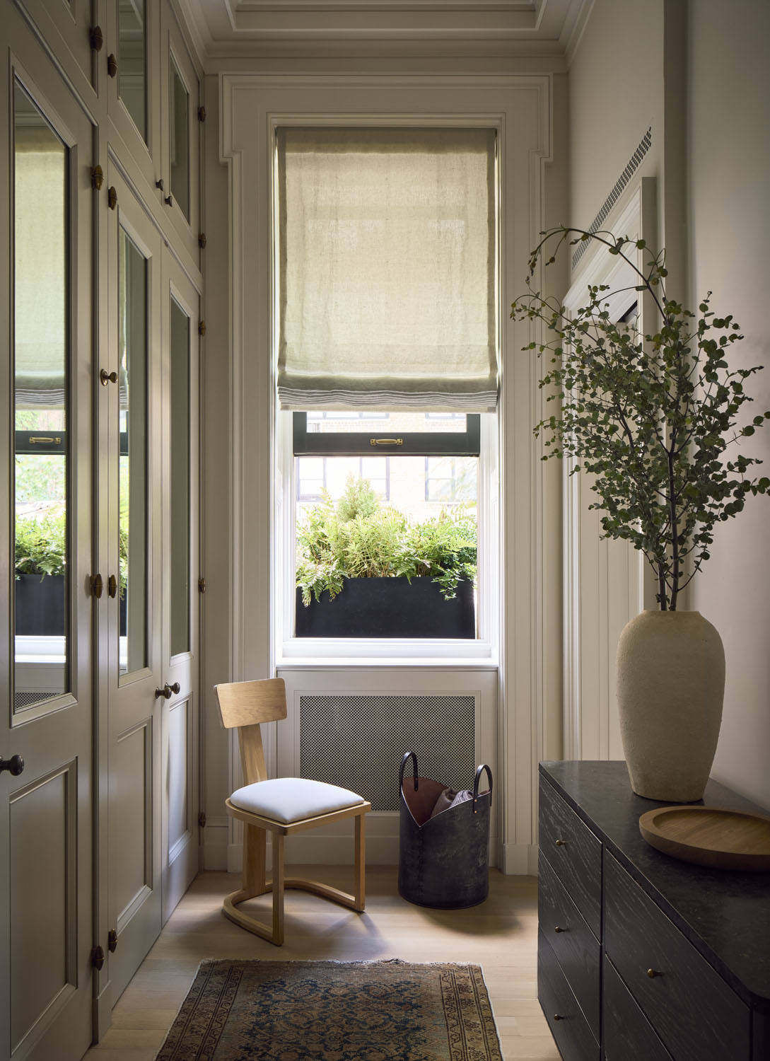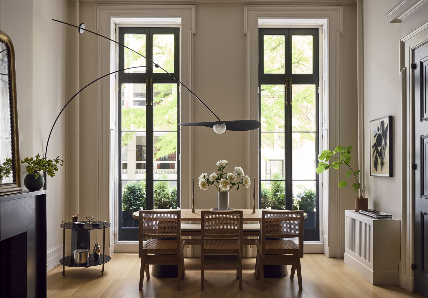 “His West Village brownstone was historically intact with soaring ceilings,” says Lind. “The previous owner [architect Gil Schafer] made some bold moves to make it appear more grandiose, so we pared it back for an understated, traditional feel.” That included a Pierre Augustin Rose sofa, ebonized coffee tables, and a custom bleached teak dining table by Michael O’Connell, “an incredible maker in Los Angeles,” Lind notes. These pieces share space with a selection of treasures (a painting by Whitney Bedford that Porch describes as “a modern take on a traditional horse painting,” vintage candlesticks, and an 18th-century mirror among them) that create a sense of dimension. “Jed has a real knack for objects—smalls, as he calls them—and did an excellent job bringing those through,” Porch effuses. “You get the organic pieces with this nod to vintage and traditional styles.”