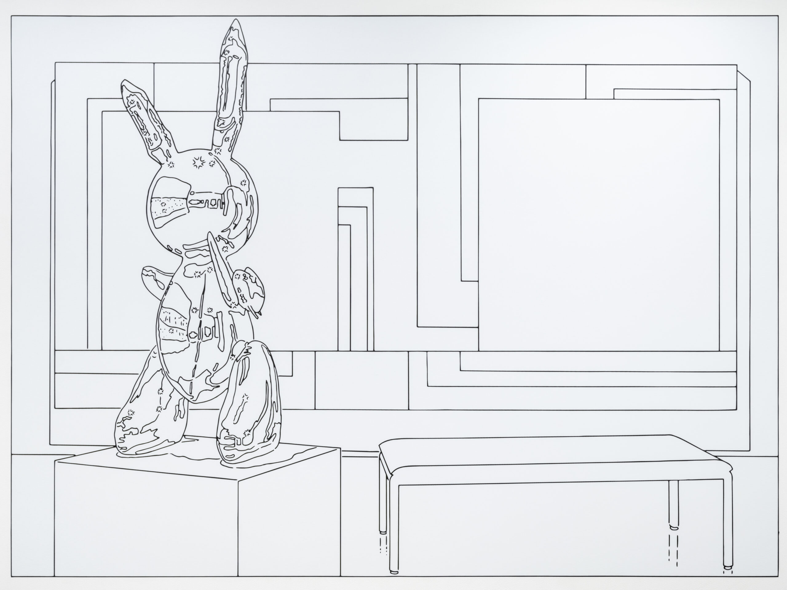 The artist has made good use of both the gallery’s gritty allure—its mysterious, almost unmarked presence in the subterranean commercial strip—and its capacity to display wares. He’s filled the floor-to-ceiling glass shopfront with a view of two MoMA-caliber works by Louise Lawler, on consignment from Sprüth Magers. Like enlarged coloring book pages, the black-and-white compositions, traced from her earlier photographs and applied as decals to a custom-built white wall, are inscrutable, drained of detail. Pristine beneath fluorescent lights, the images have a bright, cartoony graphic power that makes a startling kind of sense alongside the grimy, glowing ad spaces of the MTA labyrinth.