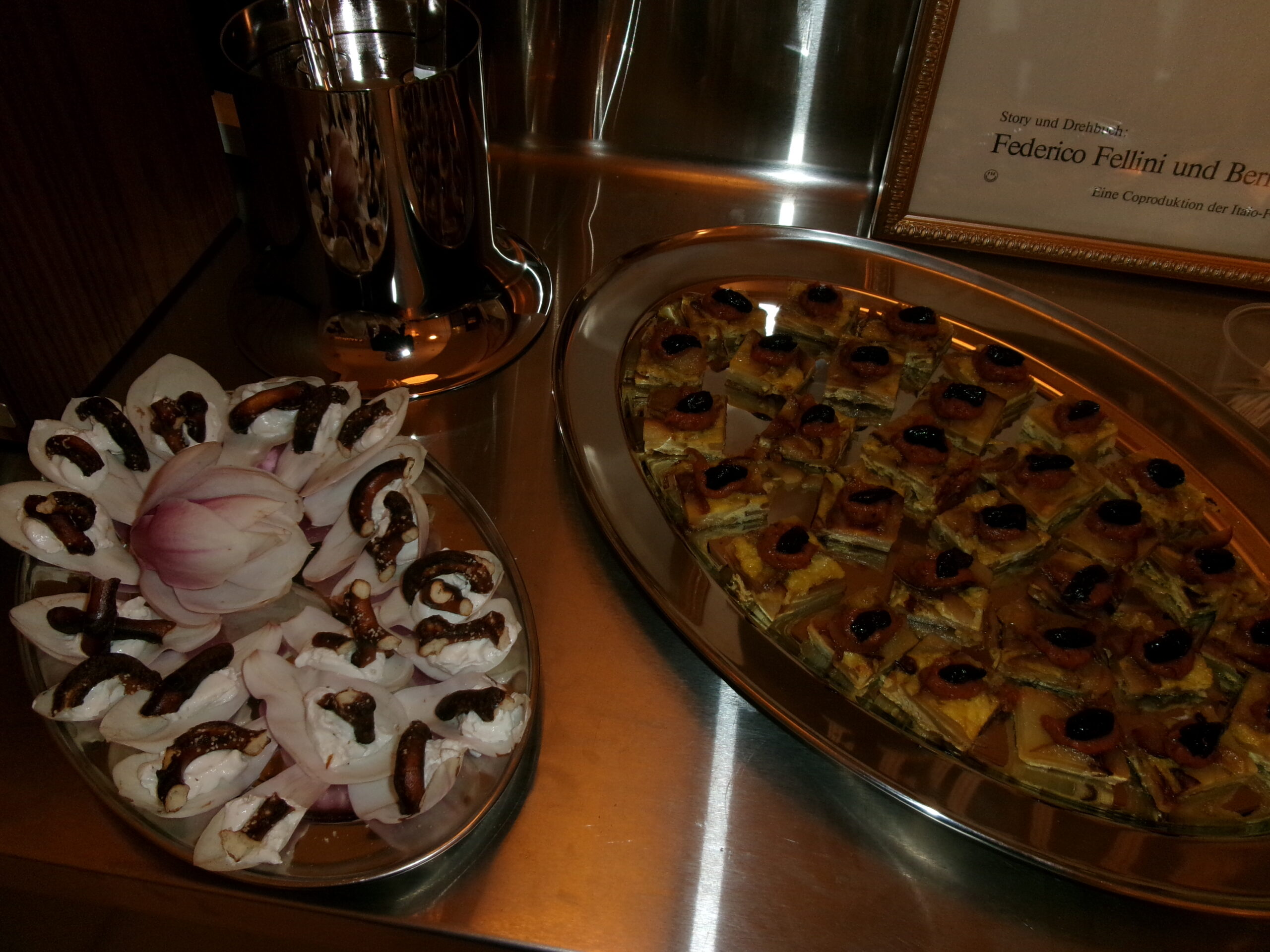 Food and Drink: Dishes were crafted by Theodor and titled by the readers, with guests grazing on “Life is Life” (nan-e nokhodchi chickpea cookies) and “one blossom at street level” (magnolia petals with labne, pretzels, and Madagascar pepper). “Perhaps twink death manifests as its own fiction” manifested as Spanish tortilla cubes with ragu ketchup and botija olives. To drink: walnut-date milk and chamomile shrub water, which confoundingly shared the same name, “sit down stand up take your pants off look at me.”